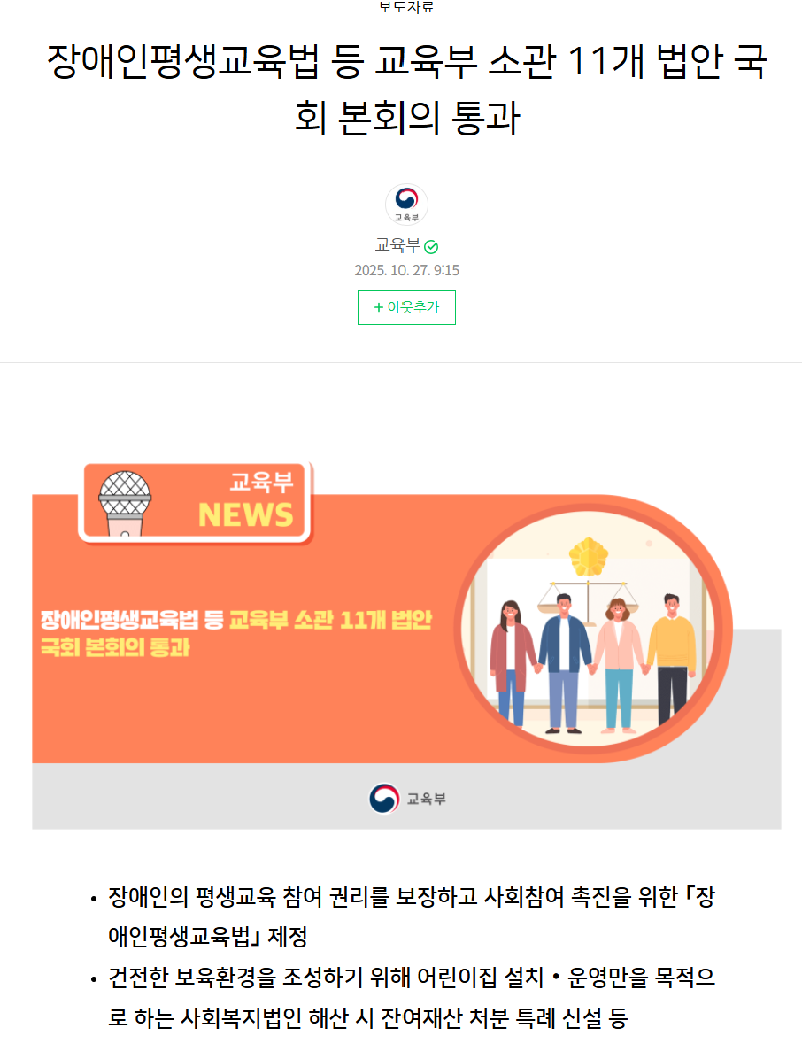 교육부는 10월 26일(일), 국회 본회의에서 「장애인평생교육법」 제정안 및 「영유아보육법」 등 10건의 일부개정법률안이 의결되었다고 밝혔다.