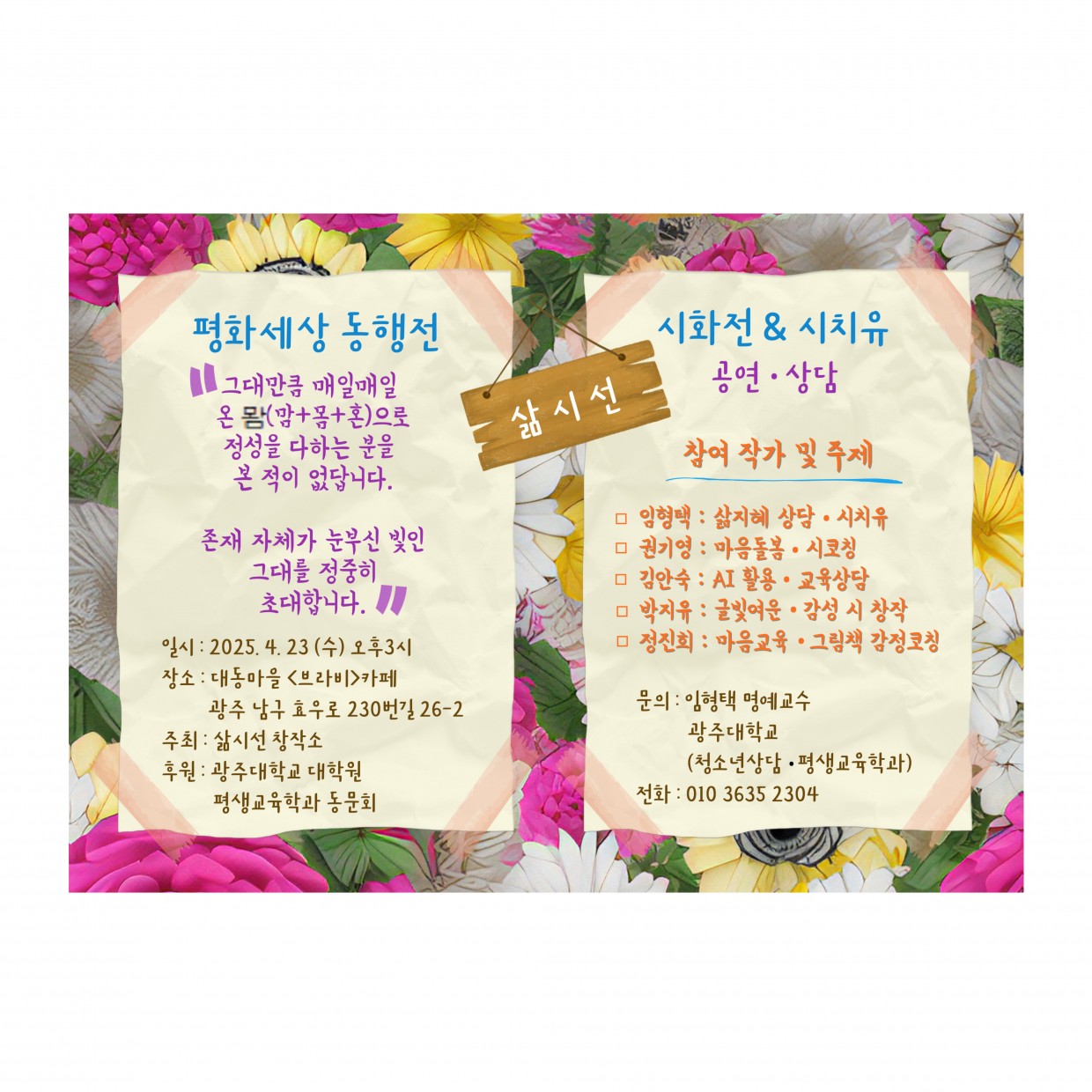 광주대학교(총장 김동진) 대학원 평생교육학과 '삶시선' 동아리 회원들이 지난 1년간 함께한 평생교육과 시 공부의 결실을 맺었다. 임형택 명예교수, 권기영, 김안숙, 박지유, 정진희 회원은 삶의 다양한 순간을 담아낸 시들을 모아 전자책 「삶의 시선」을 출간하고, 이를 기념하는 시화전을 개최했다.