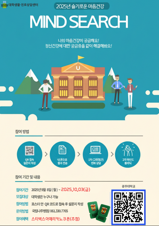 [대학생활·진로상담센터]내 마음이 궁금하다면?] 페이지 정보 작성자 관리자 댓글 0건 조회 31회 작성일 25-10-02 10:09 목록 본문 [대학생활·진로상담센터]내 마음이 궁금하다면?] 이전글제2회 청평과 청소년 프로그램 개발 경진대회 공모 25.10.14 다음글[대학생활·진로상담센터] 발표불안 극복을 위한 [발표불안 탈출!!] 집단상담 안내 25.09.25 댓글 0 댓글목록 등록된 댓글이 없습니다.