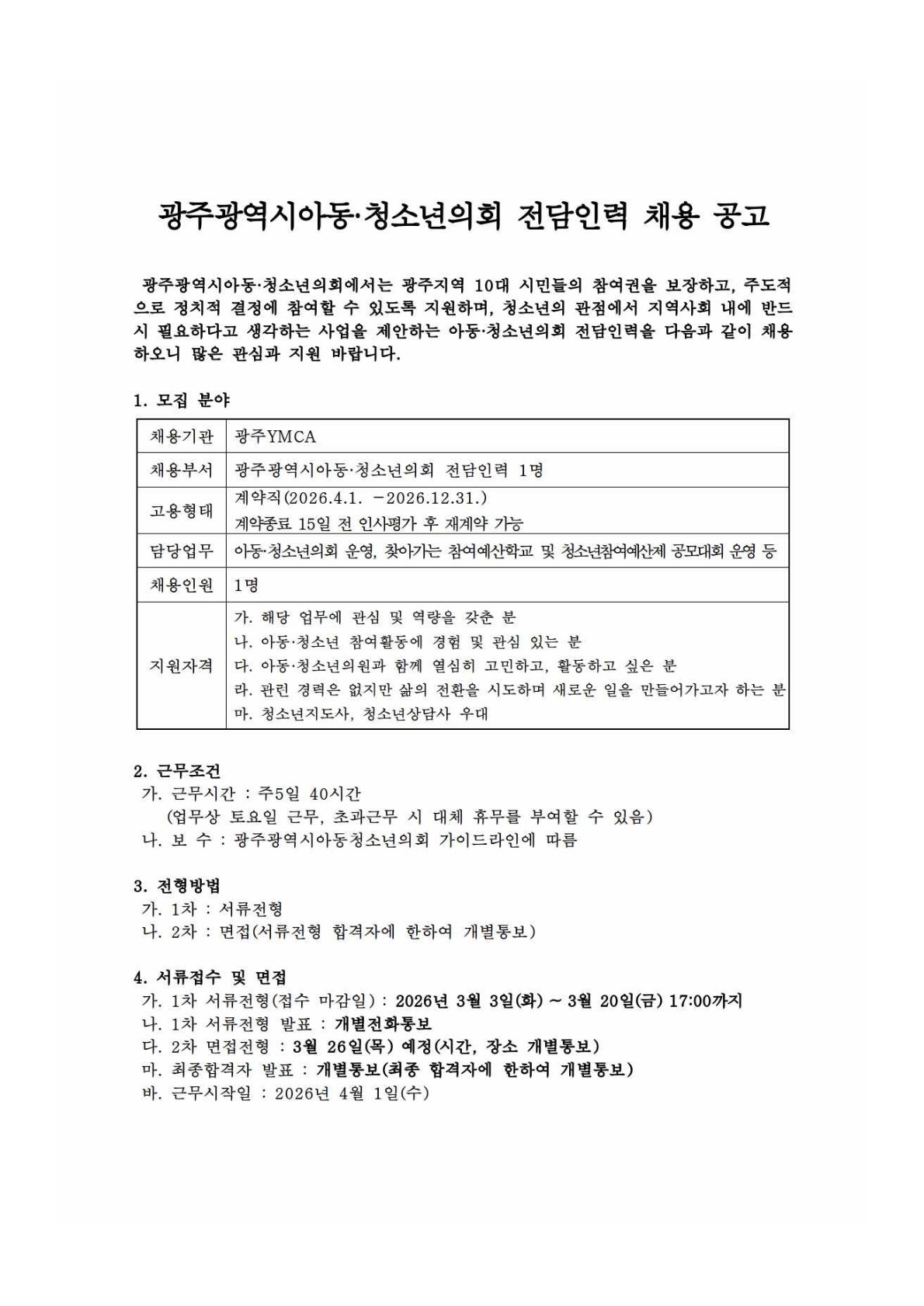 광주광역시아동·청소년의회 전담인력 채용 공고