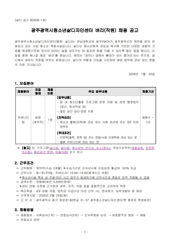 ㅇ 서류합격자 발표 : 2026년 2월 6일(금) 14:00 예정 ※삶디 홈페이지(http://samdi.or.kr/) 공지 및 합격자 개별 통보