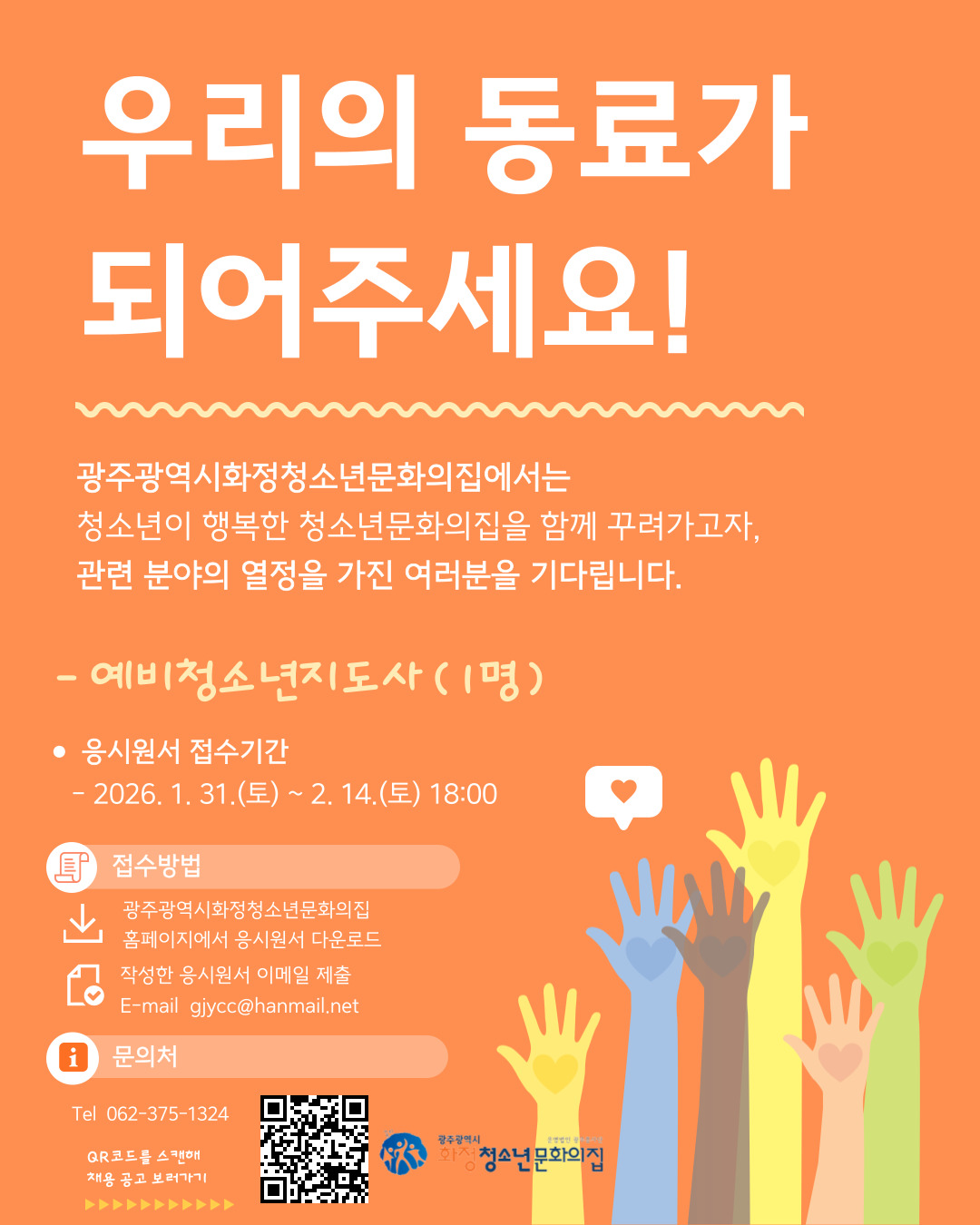 광주광역시화정청소년문화의집에서는 청소년이 행복한 청소년문화의집을 함께 꾸려가고자, 관련 분야의 전문성과 열정을 가진 여러분을 기다립니다.