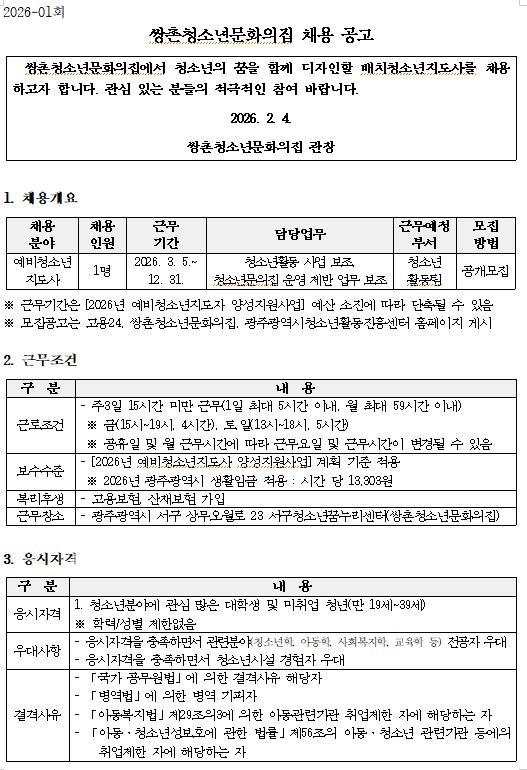 2026년 쌍촌청소년문화의집 예비청소년지도사 채용공고 및 응시원서.hwpx (76.7K)