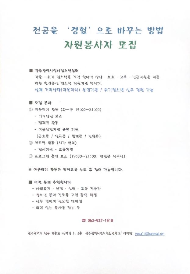 광주광역시일시청소년쉼터에서 자원봉사자를 모집합니다!